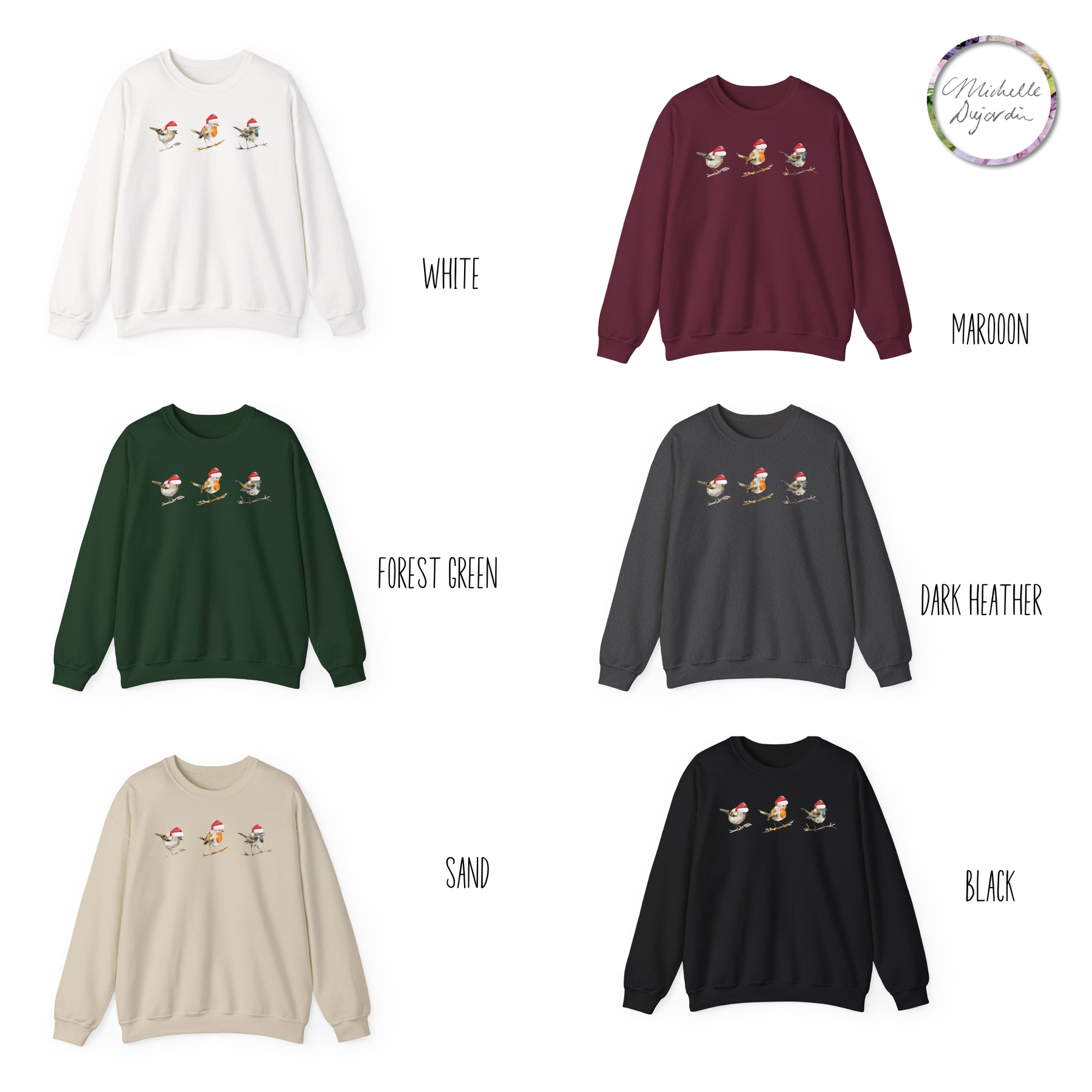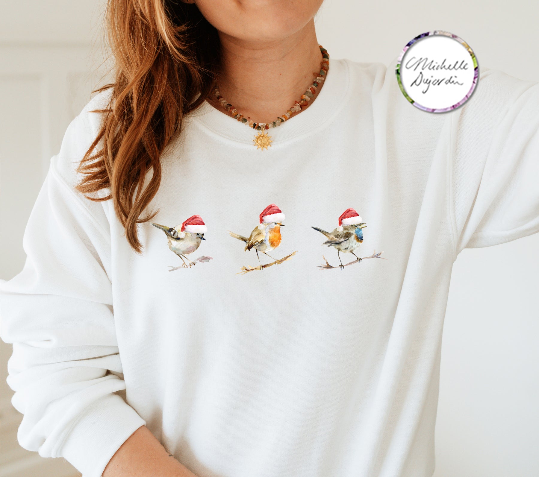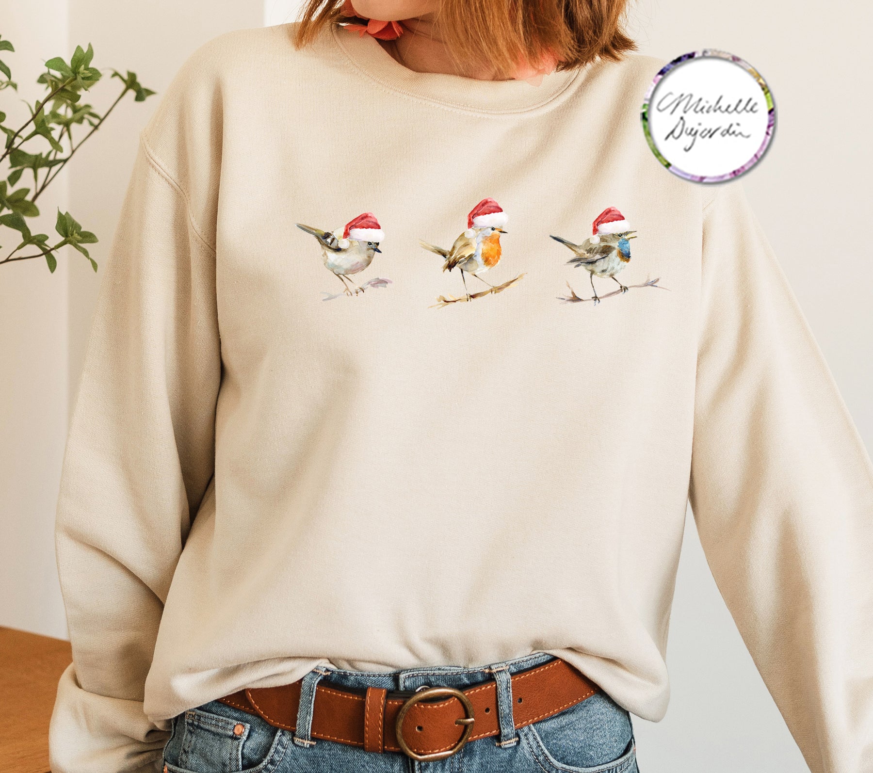 Een kersttrui met drie kleine vogeltjes met kerstmutsen — een roodborstje, blauwborstje en goudhaantje — geschilderd door Michelle Dujardin.