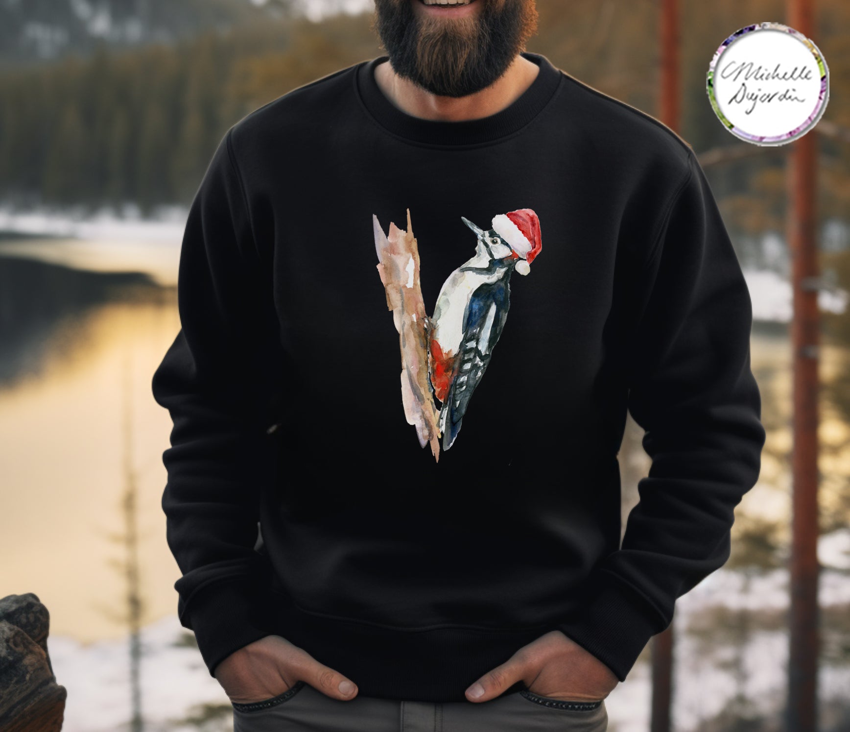 Vier de feestdagen met deze kersttrui met een specht met kerstmuts, geschilderd door Michelle Dujardin.