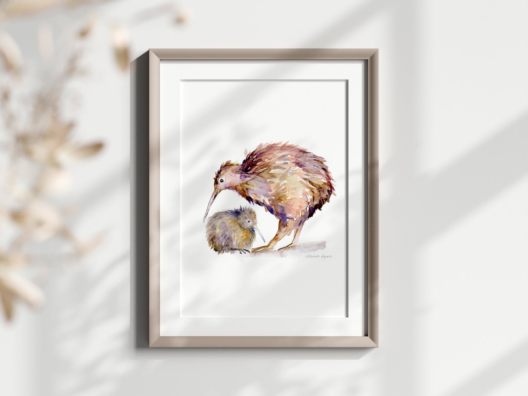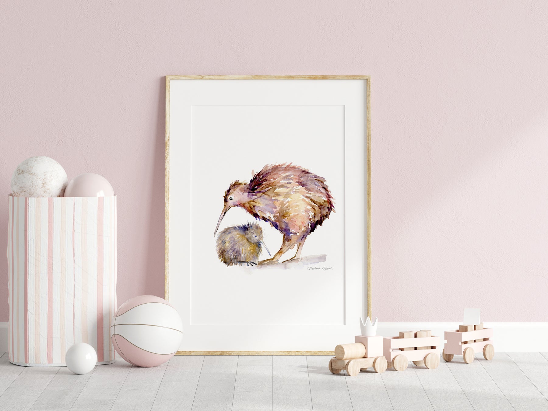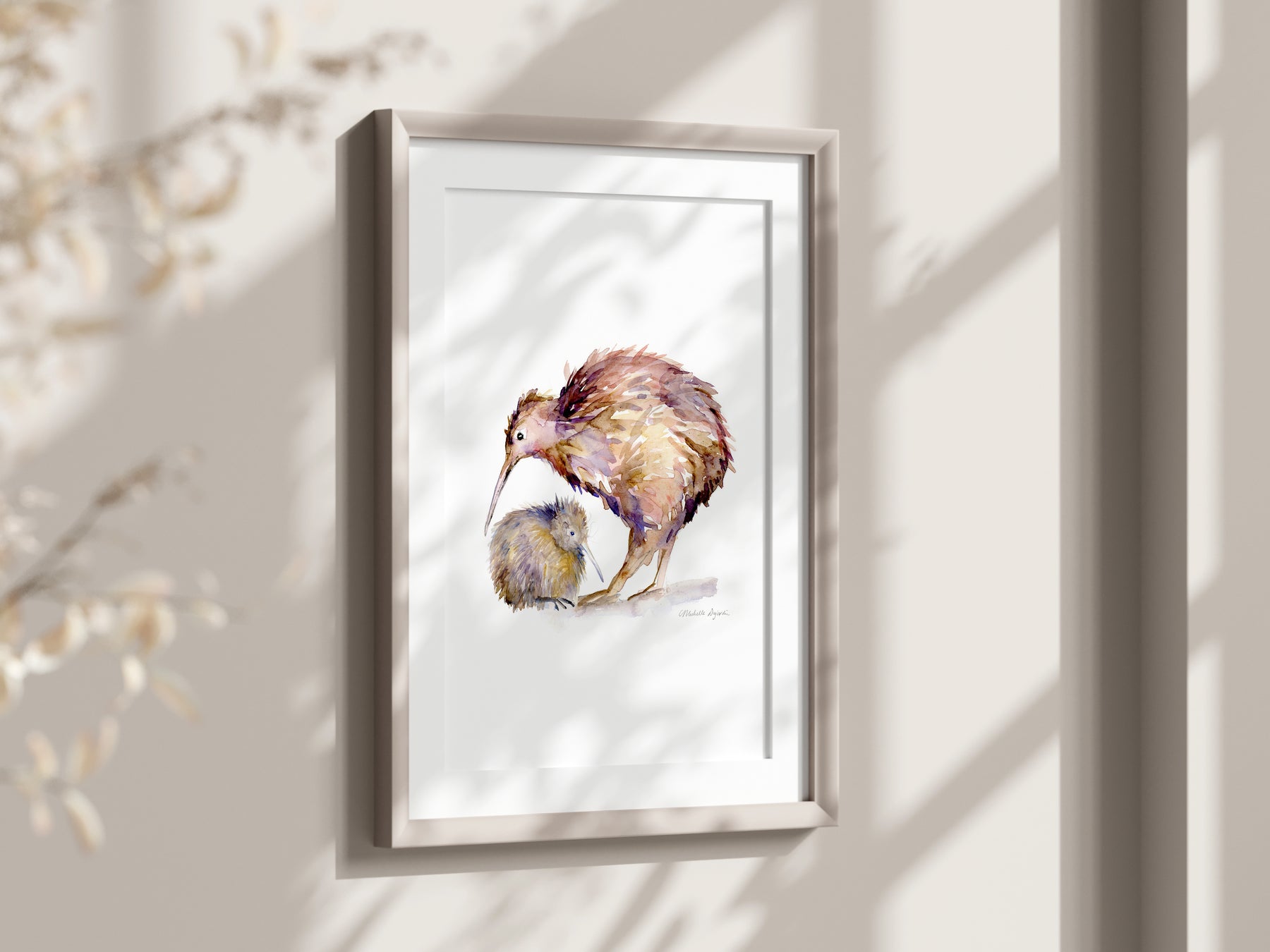 Deze fine art print van een kiwi moeder/ ouder met  kuiken brengt een zachte, liefdevolle sfeer in elke babykamer of kinderkamer.