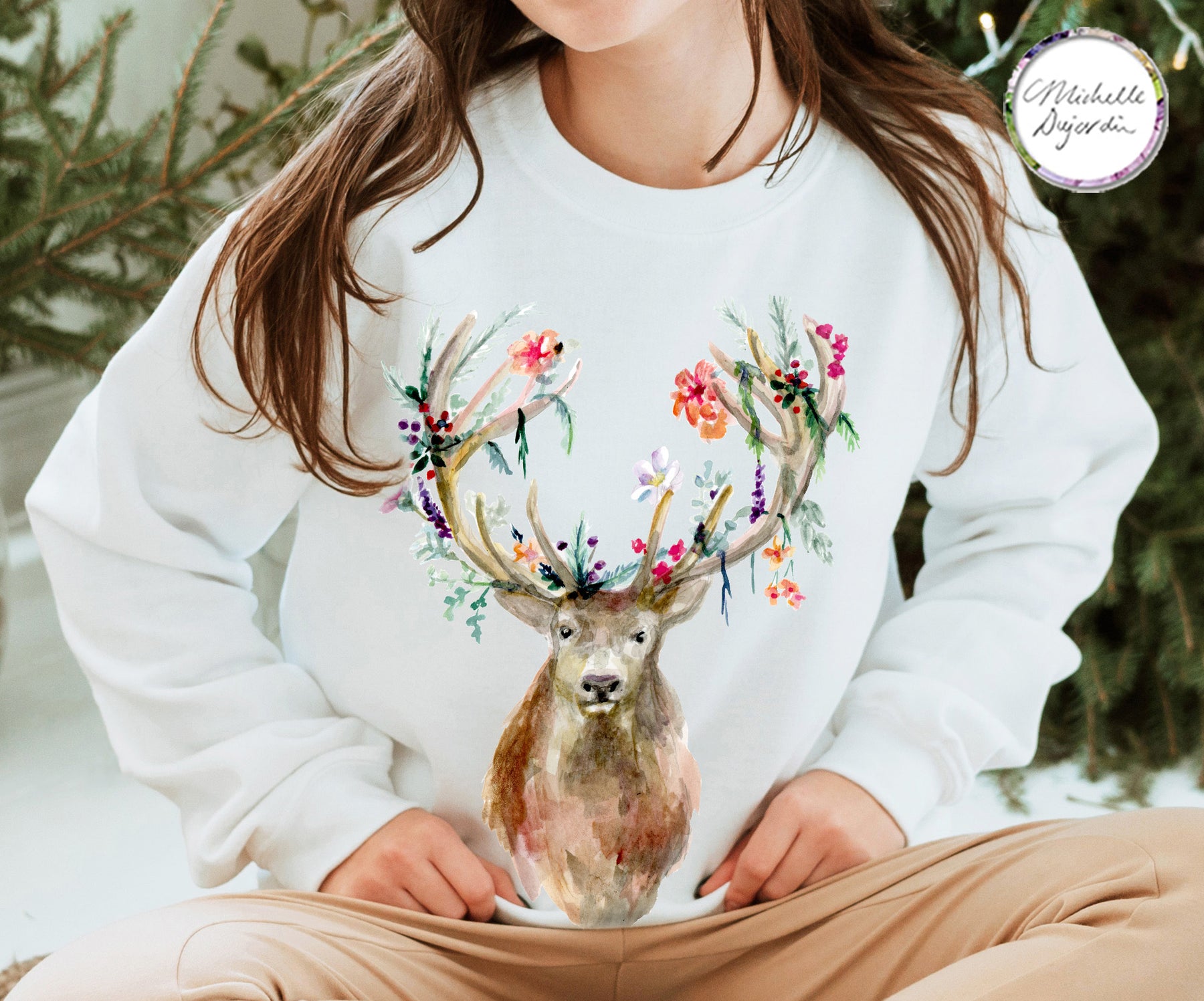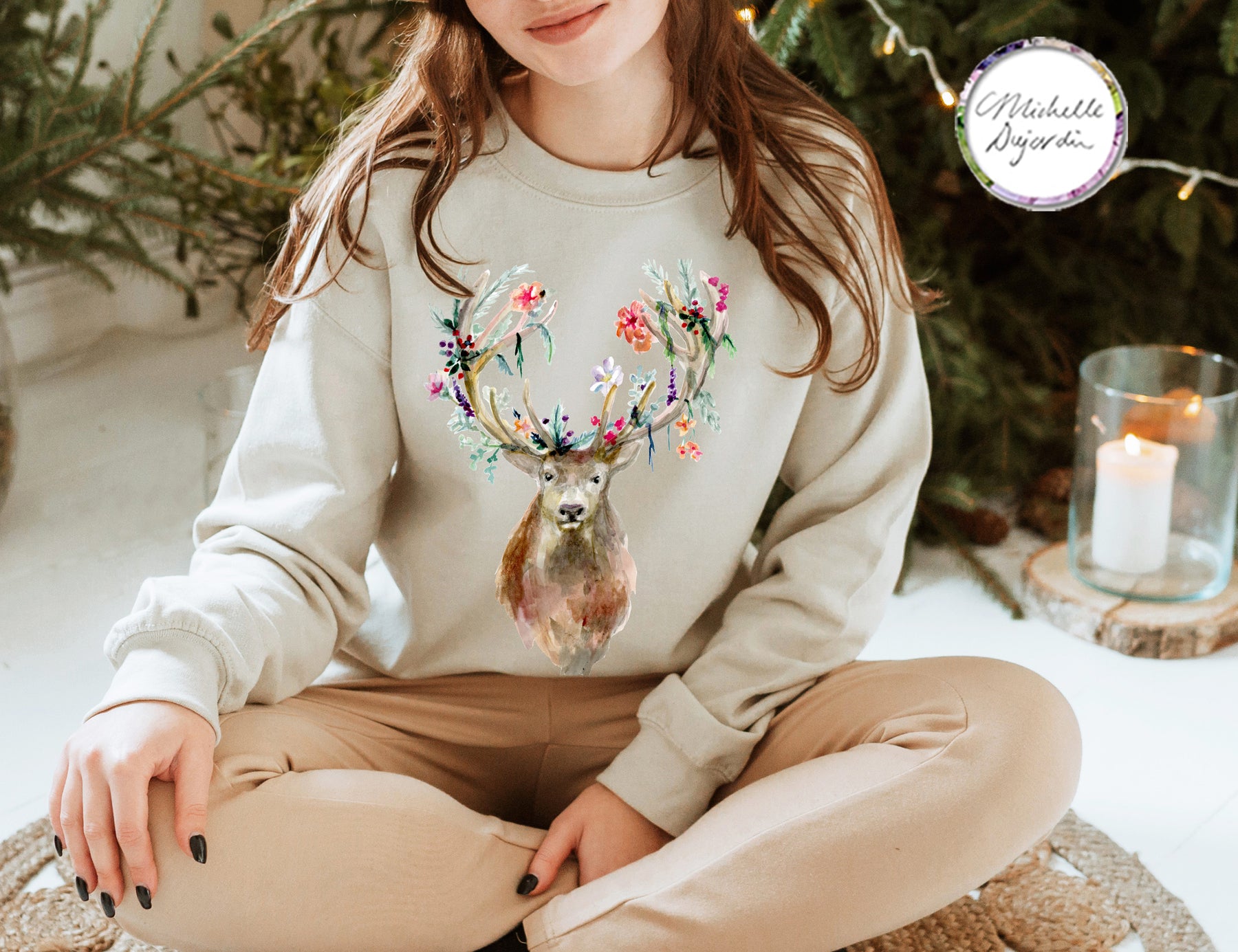 Deze zachte sweater toont een aquarelportret van een hert met prachtig versierd gewei — met takjes, bloemen en dennengroen — geschilderd door Michelle Dujardin.