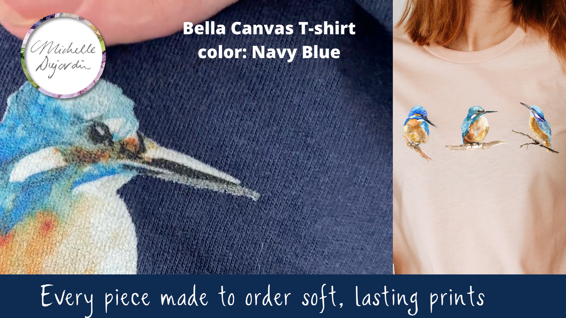 Nadat u uw bestelling heeft geplaatst, wordt uw T-shirt speciaal voor u gemaakt, met een artwork van Michelle Dujardin op de stof gedrukt.