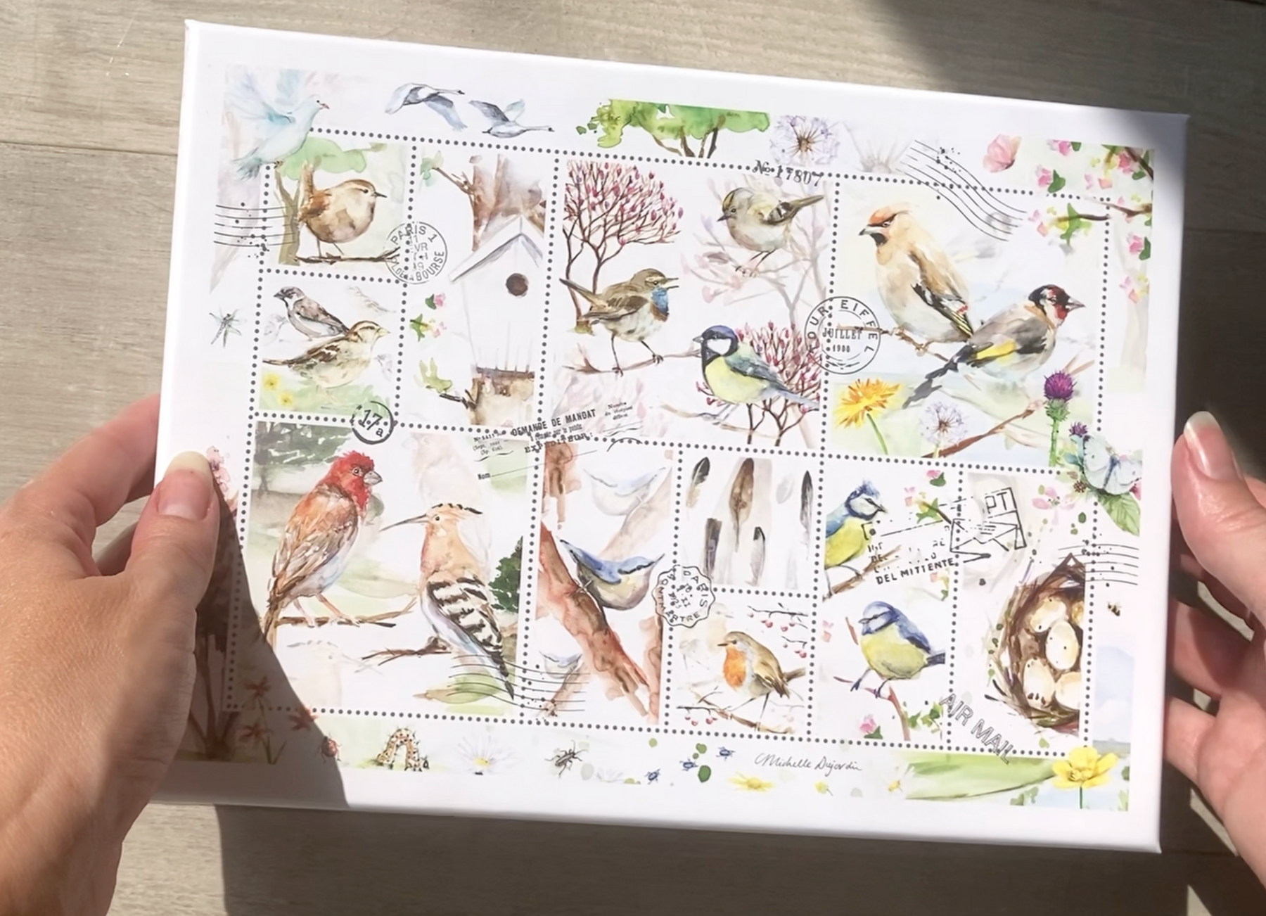 Unieke legpuzzel Birds on Stamps, geïllustreerd door Michelle Dujardin.
