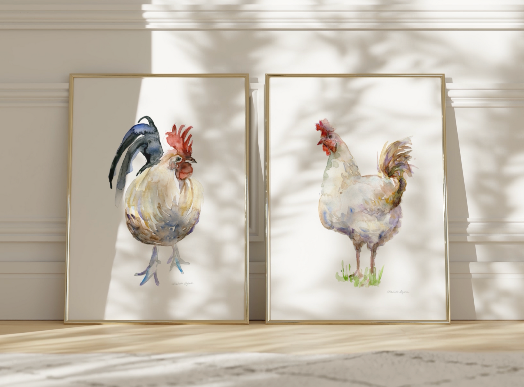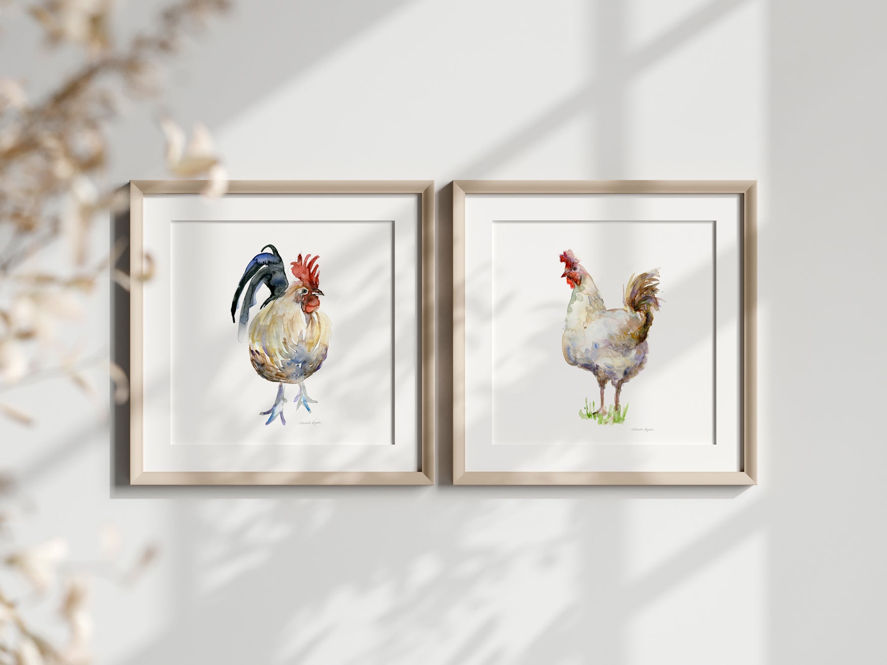Breng een landelijke sfeer in huis met deze set van 2 aquarelprints van een kip en een haan, geschilderd door Michelle Dujardin.