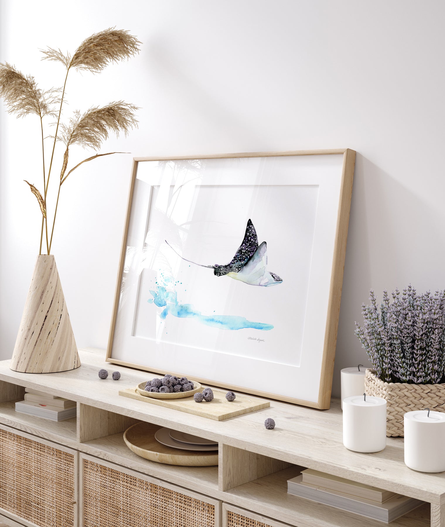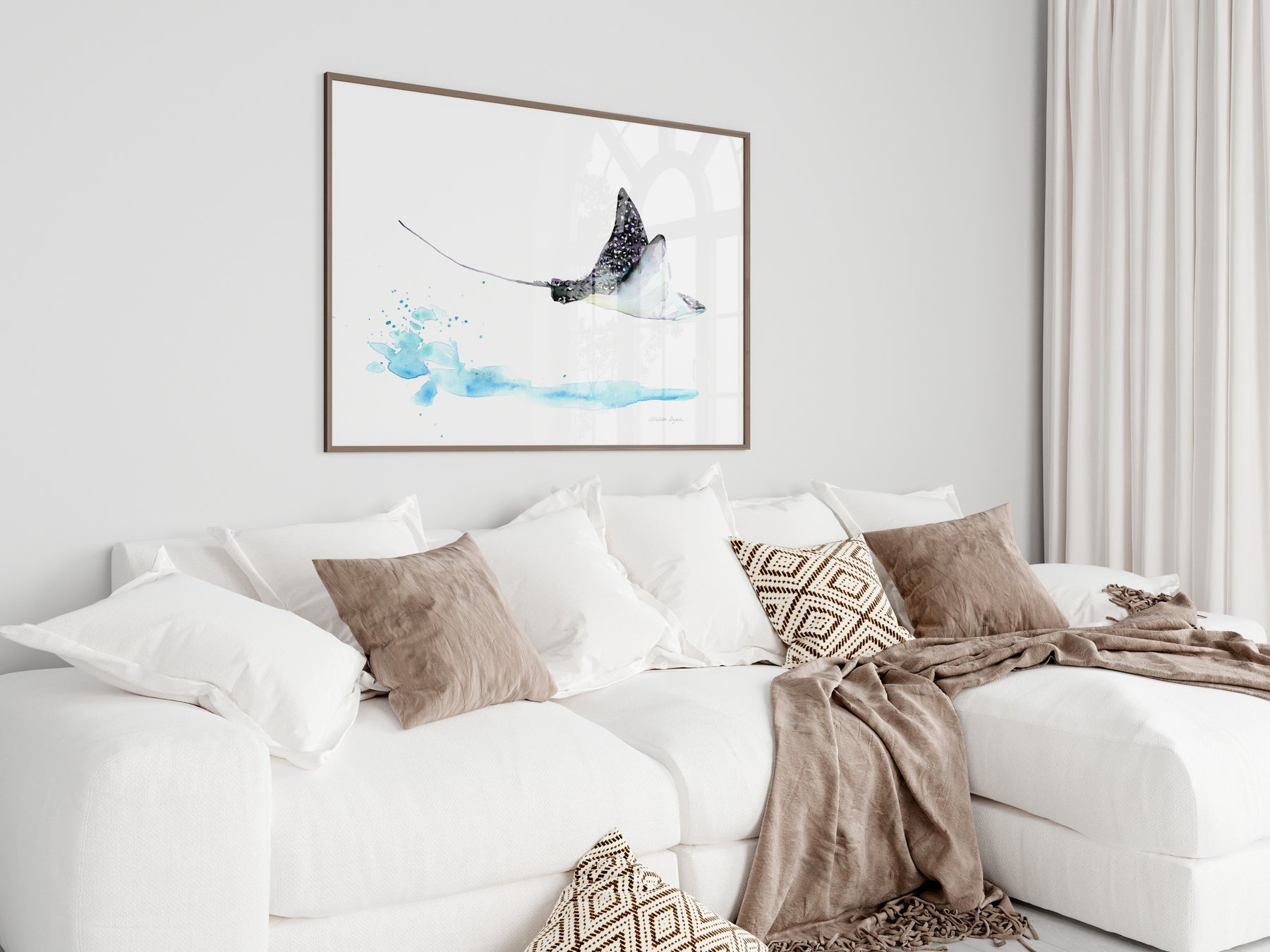 Framed artwork of a manta ray on a wall in a modern living room.