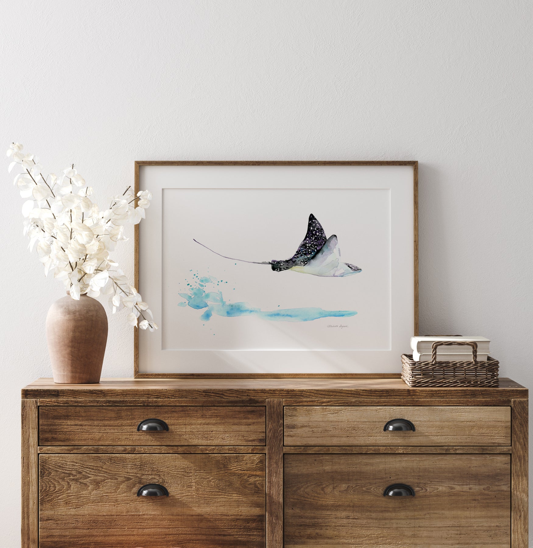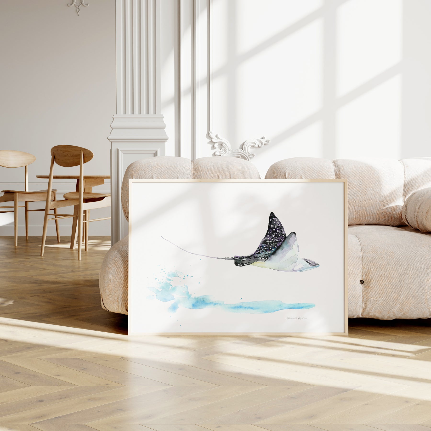 Framed artwork of a stingray on a white wall with wooden floor.