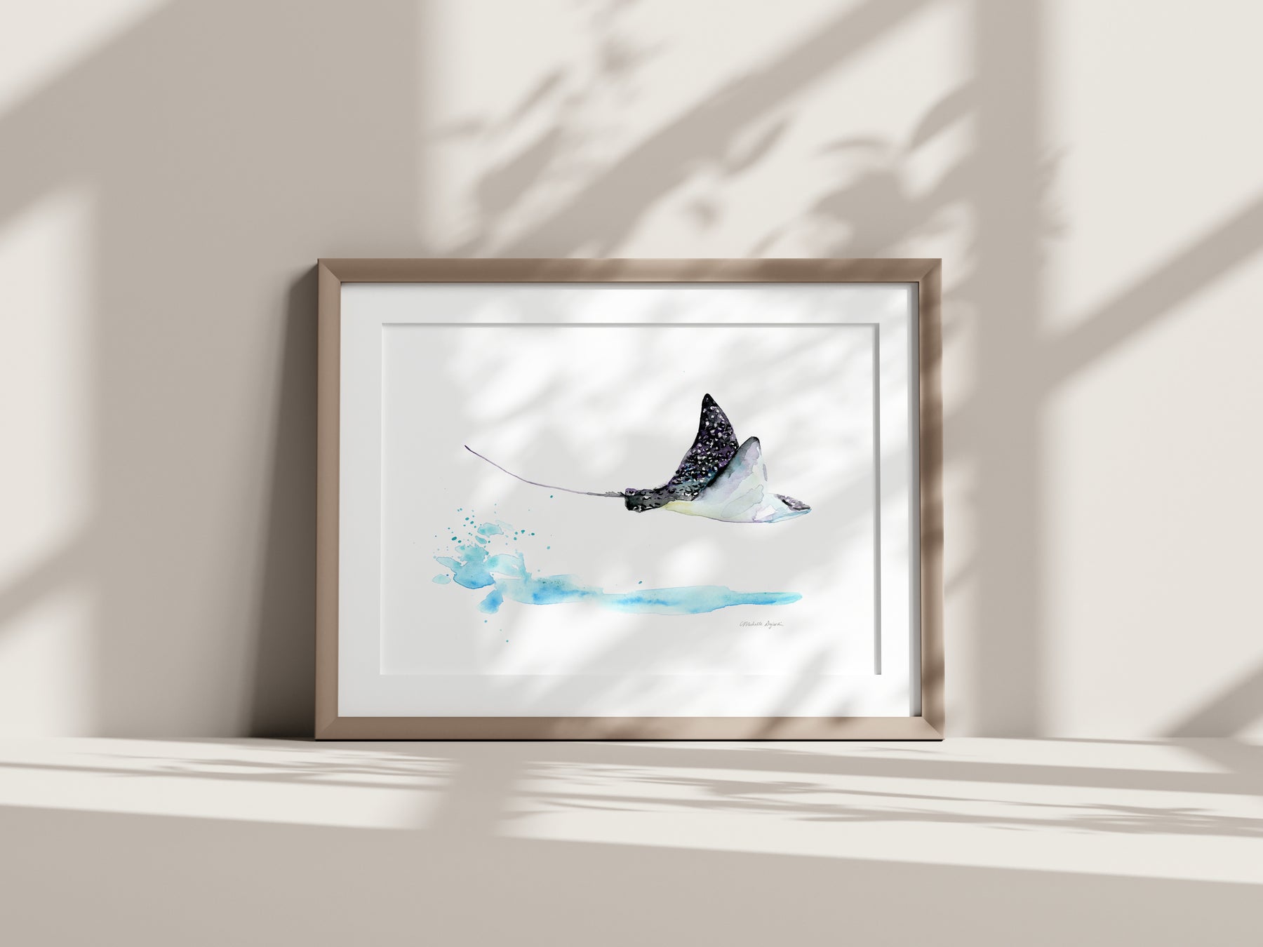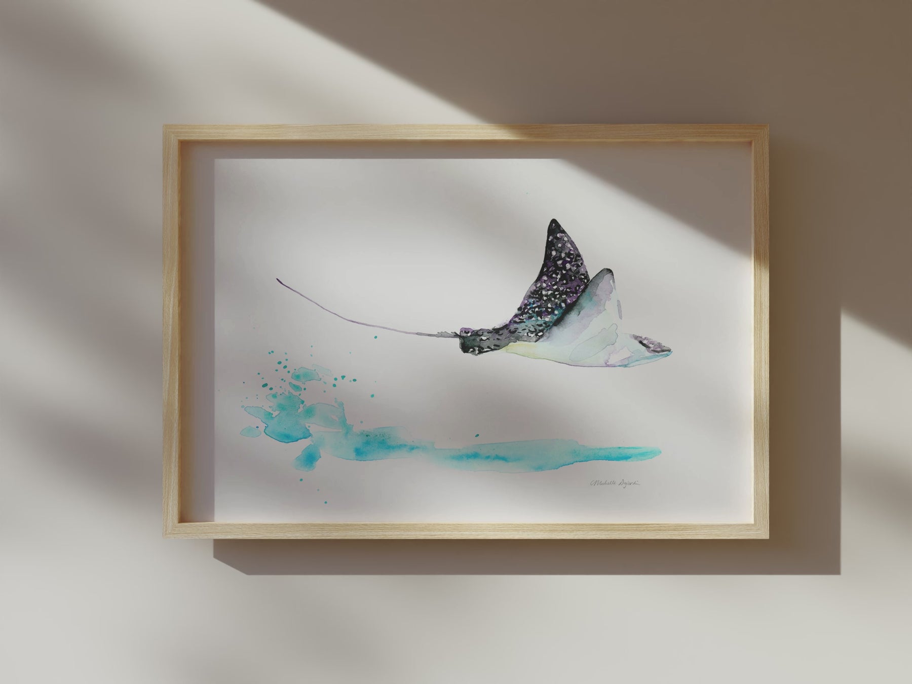 Deze aquarel print toont een springende adelaarsrog boven het wateroppervlak. De vloeiende penseelstreken en zachte blauwtinten geven een gevoel van beweging, vrijheid en open zee.