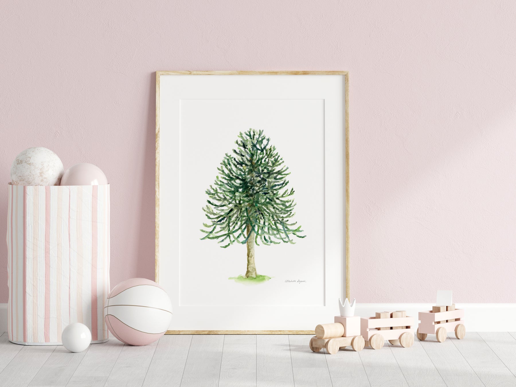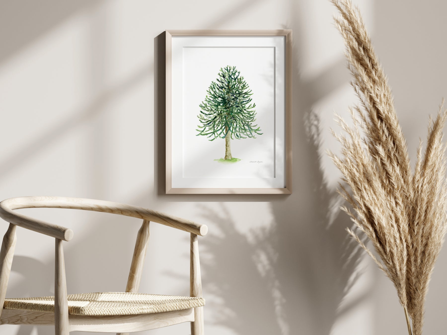 Aquarelprint van de slangenden (Araucaria araucana), één van de oudste boomsoorten ter wereld, geschilderd door Michelle Dujardin.
