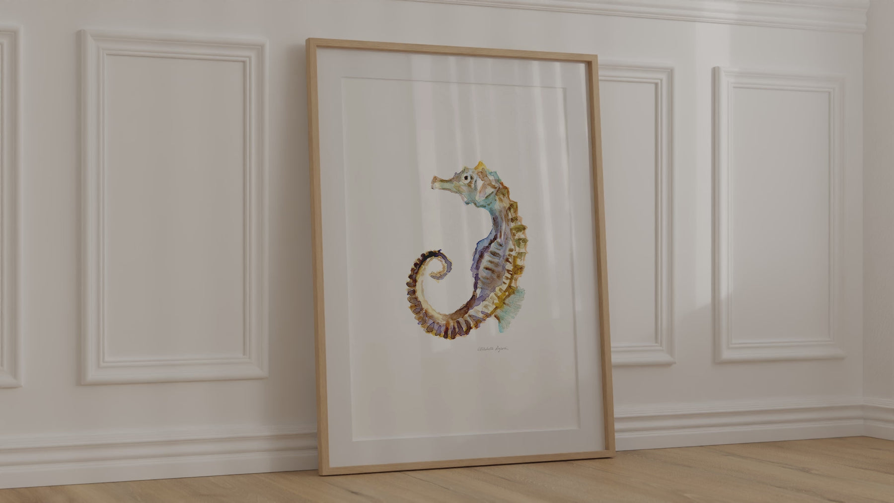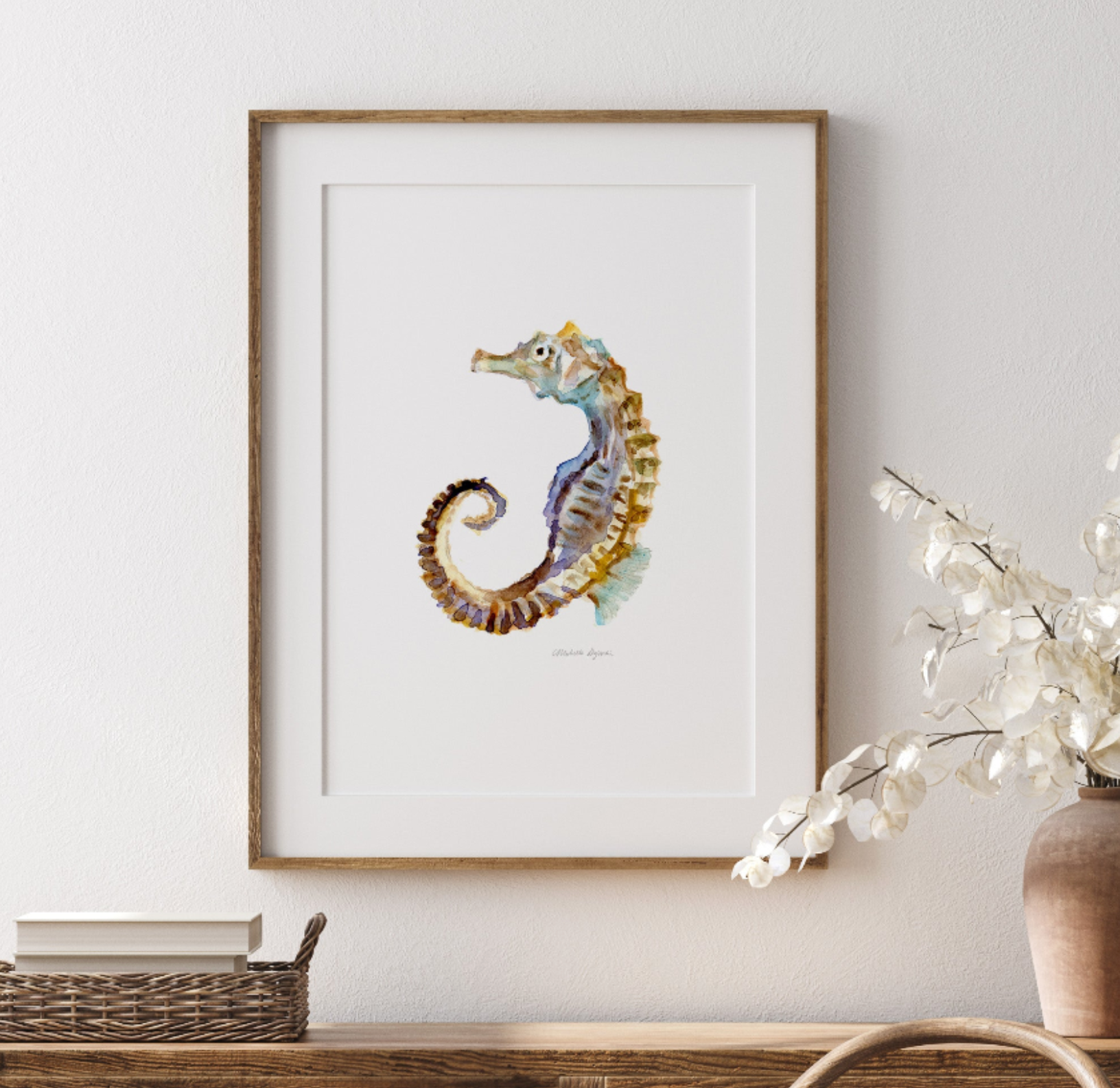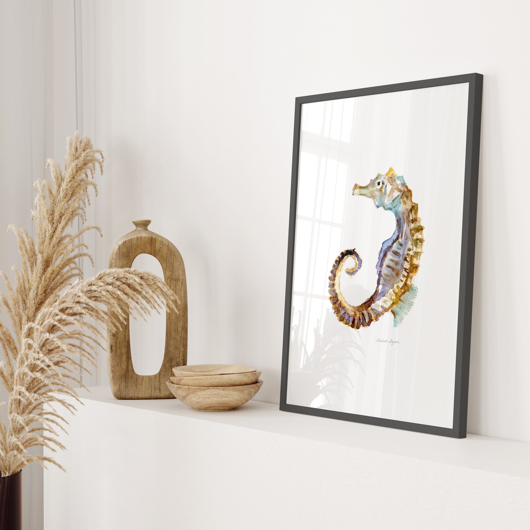 Breng de rust van de zee in huis met deze aquarelprint van een zeepaardje, geschilderd door Michelle Dujardin.