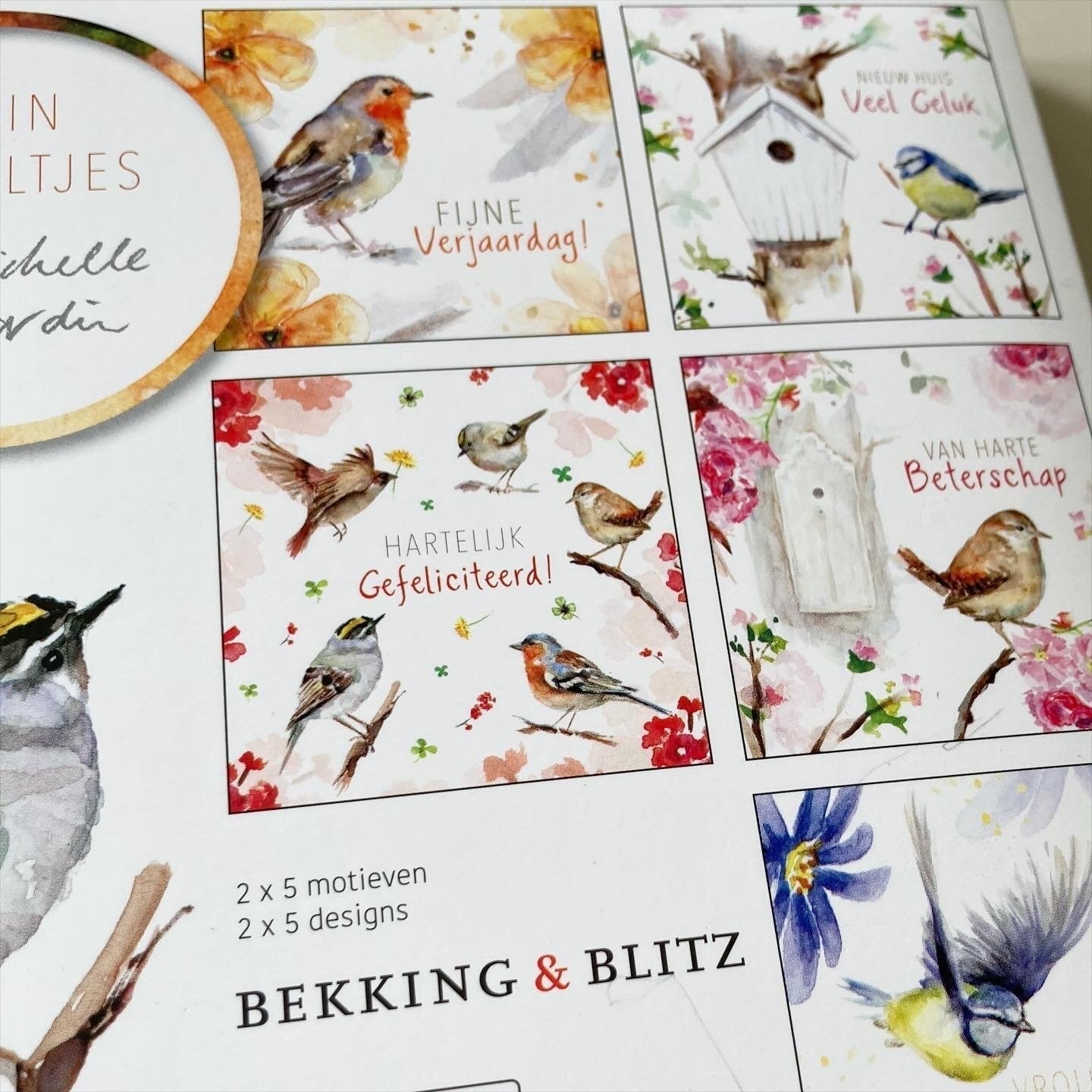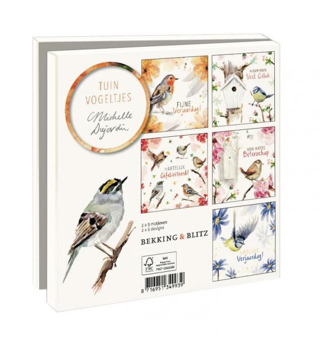 Elke mapje bevat 10 kleurrijke wenskaarten met tuinvogels. Elke set bevat 5 verschillende illustraties van een roodborstje, pimpelmees, winterkoninkje, vliegende pimpelmees en meerdere vogels. Met tekst in het Nederlands.