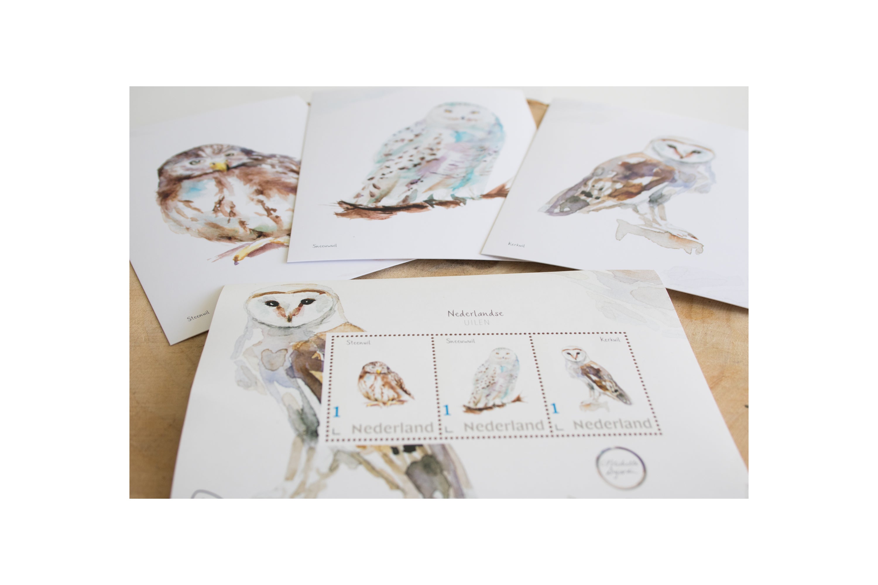 The stamps featured three different owl species: the barn owl (one of my personal favorites), the little owl, and the snowy owl – each illustrated in soft watercolor tones that highlight their unique character. This diversity made the set appealing not just to stamp collectors, but also to owl enthusiasts and nature lovers. These stamps quickly became more than just a design project. As COVID-19 changed daily life, people began sending more handwritten cards to loved ones. The owl stamps sold out within a month – even before I could order a set myself. Thankfully, I received a few designer copies, and my partner Willem managed to get a set online.