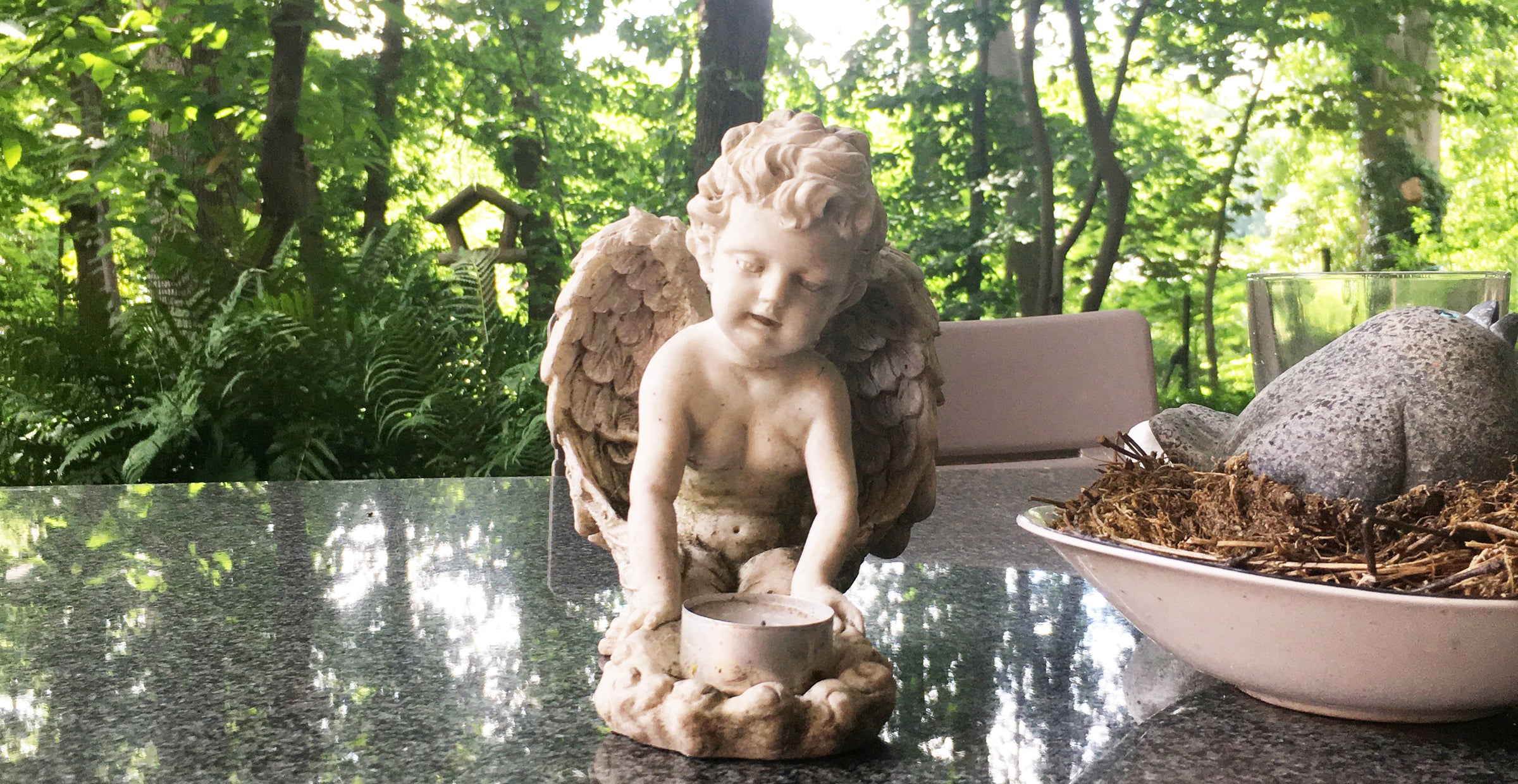 Sometimes, an object speaks to you in a way you simply can’t ignore. During a quiet moment in the beautiful garden of my Airbnb, surrounded by birds and trees, my eyes kept returning to a small angel candle-holder on the table in front of me. I had planned to draw some of the flowers—but the angel kept asking for my attention: “Draw me.”