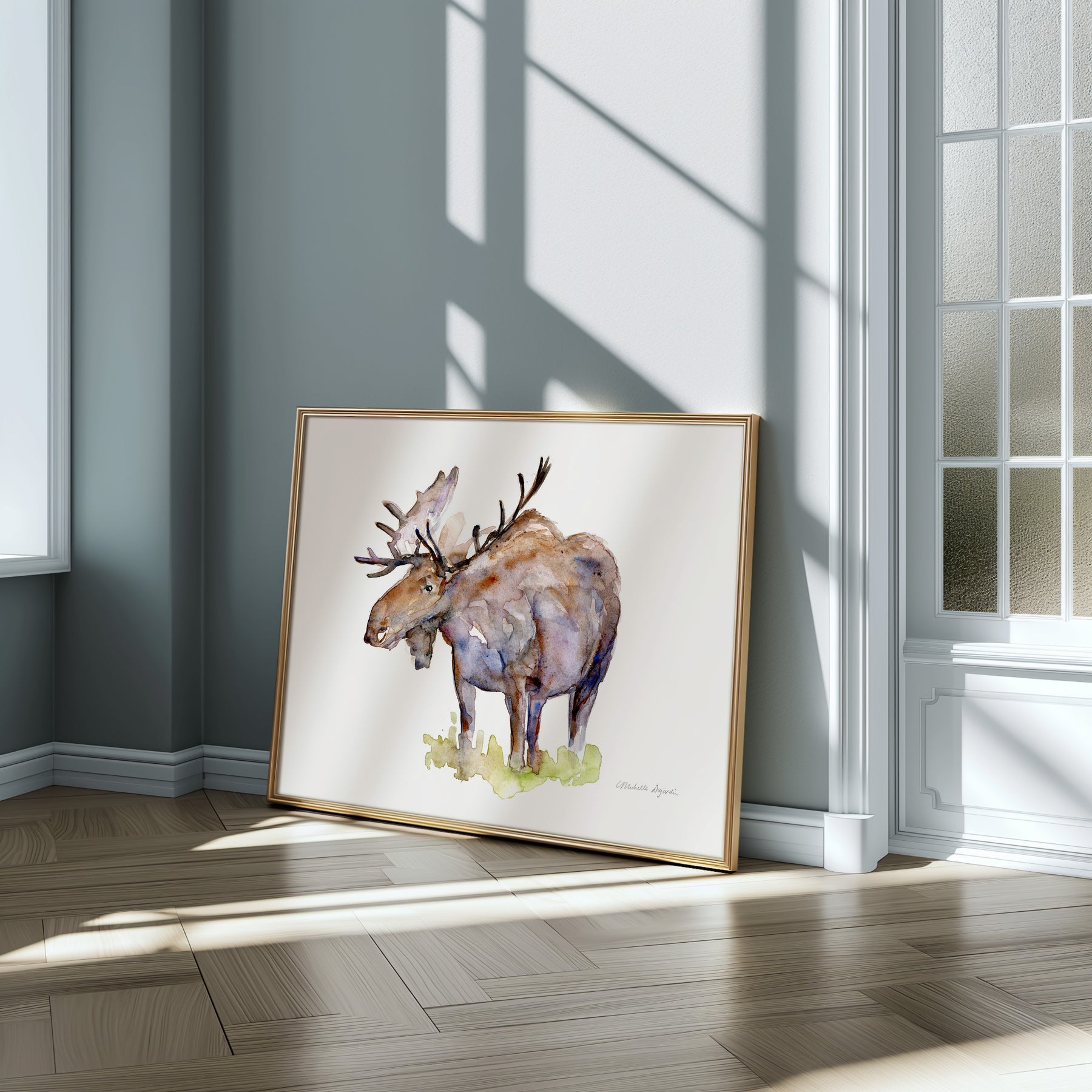 Moose watercolor painting in large frame, painted by Michelle Dujardin