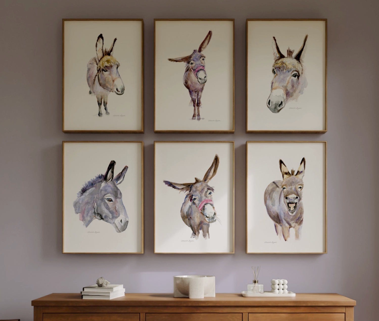 Add a touch of charm and humor to your home or nursery with this cheerful set of 6 donkey watercolor prints by Michelle Dujardin.