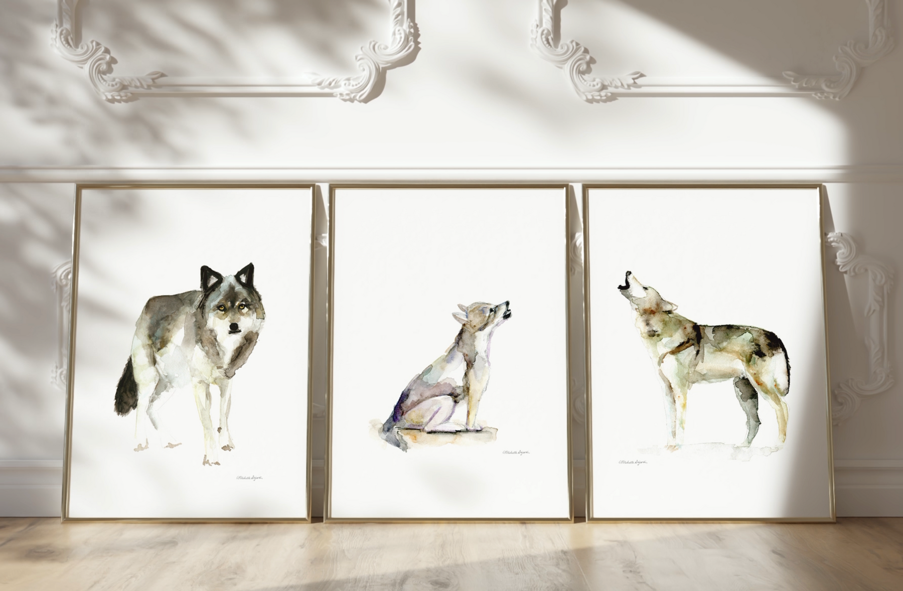 This expressive set of 3 wolf watercolor art prints portrays a wolf family with two adult wolves and a wolf pup; with the pup howling, answered by one of the adults. A gentle symbol of belonging, connection and natural communication.
