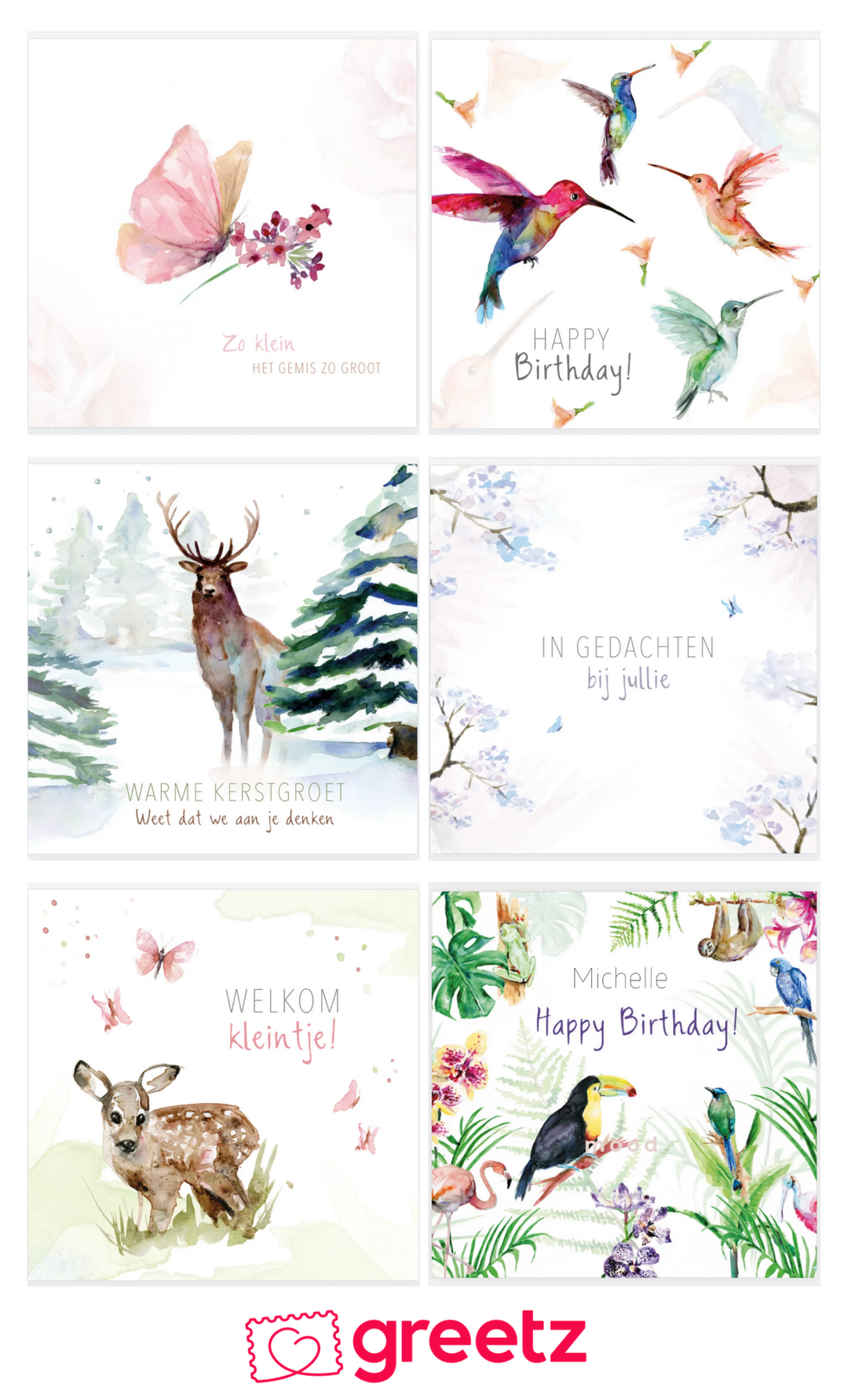 Greetz.nl offers a wide collection of customizable greeting cards featuring the nature-inspired illustrations of Michelle Dujardin. The range includes cards for all kinds of occasions and relationships – from joyful milestones to more sensitive moments in life.