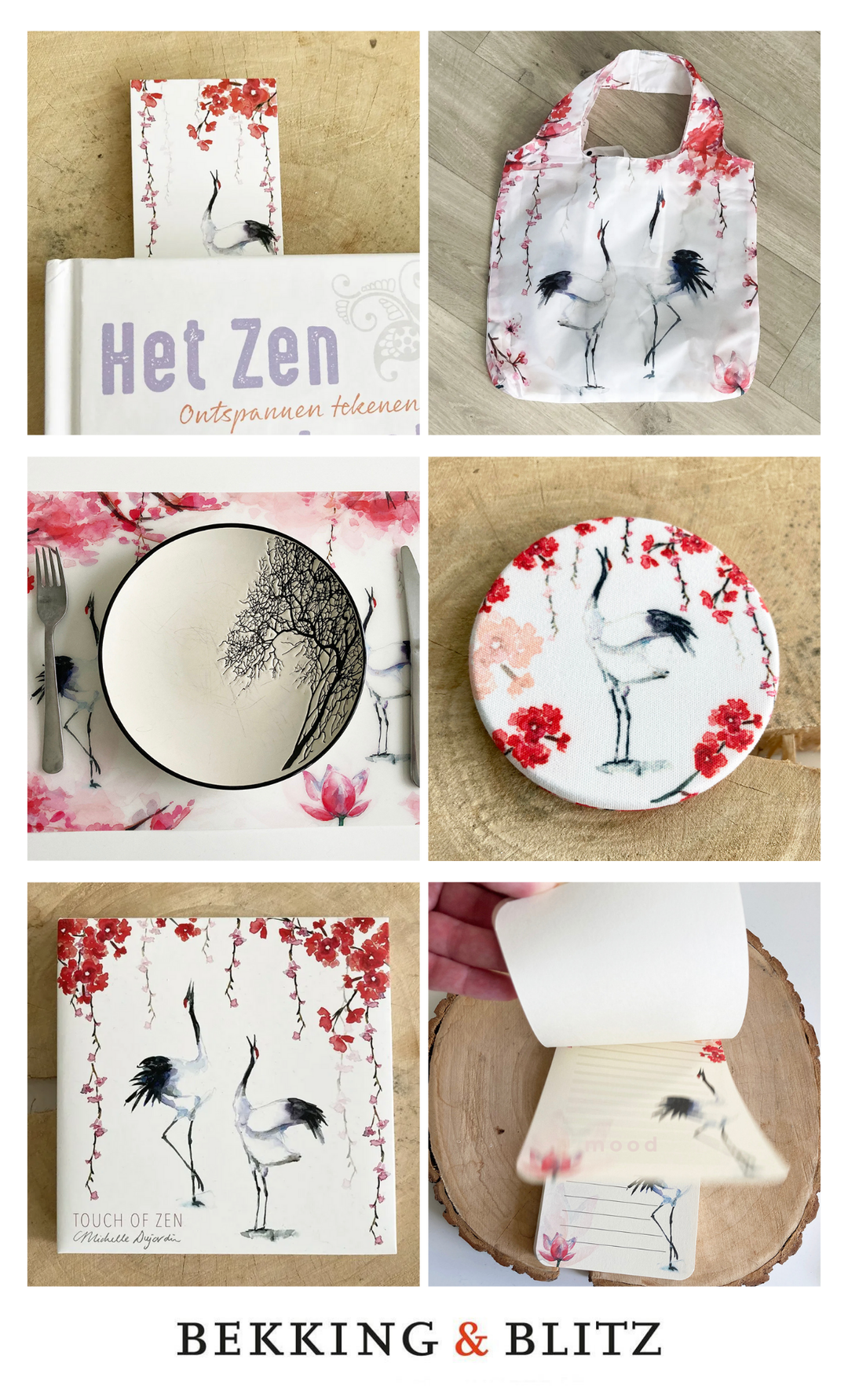 Touch of Zen is a refined stationery and gift collection by Bekking & Blitz released in 2021 and inspired by the elegance of the red-crowned crane. The designs feature dancing cranes in bold red, black and white tones, set against delicate blossom-like floral patterns.