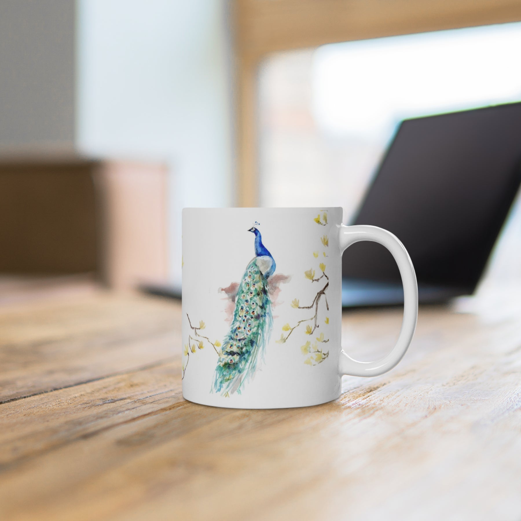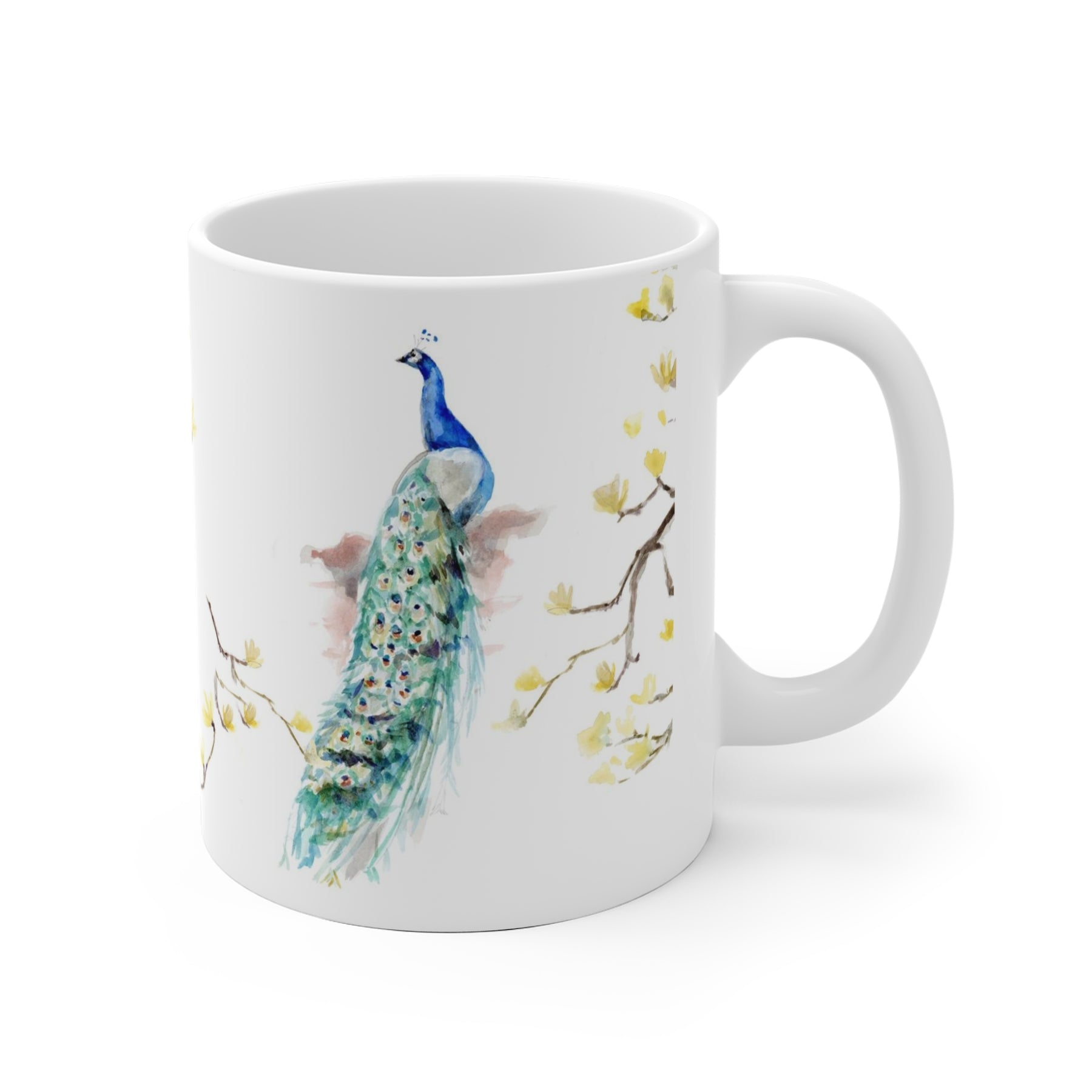 The design shows a graceful peacock surrounded by delicate branches with soft yellow blossoms. The composition and colours give the mug a subtle Asian-inspired and Zen-like atmosphere. Painted in a loose, intuitive watercolor style, the artwork invites a moment of stillness and attention.
