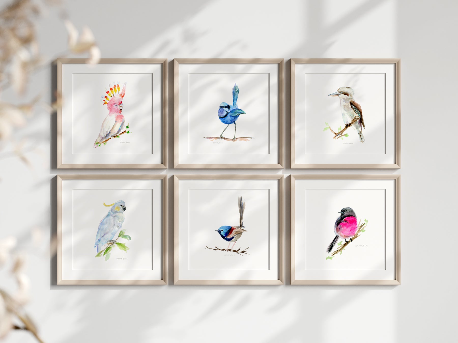 Deze zachte en kleurrijke set van 6 Australische vogelprints toont een prachtige selectie van iconische soorten, geschilderd in roze, blauwe en witte tinten door Michelle Dujardin.