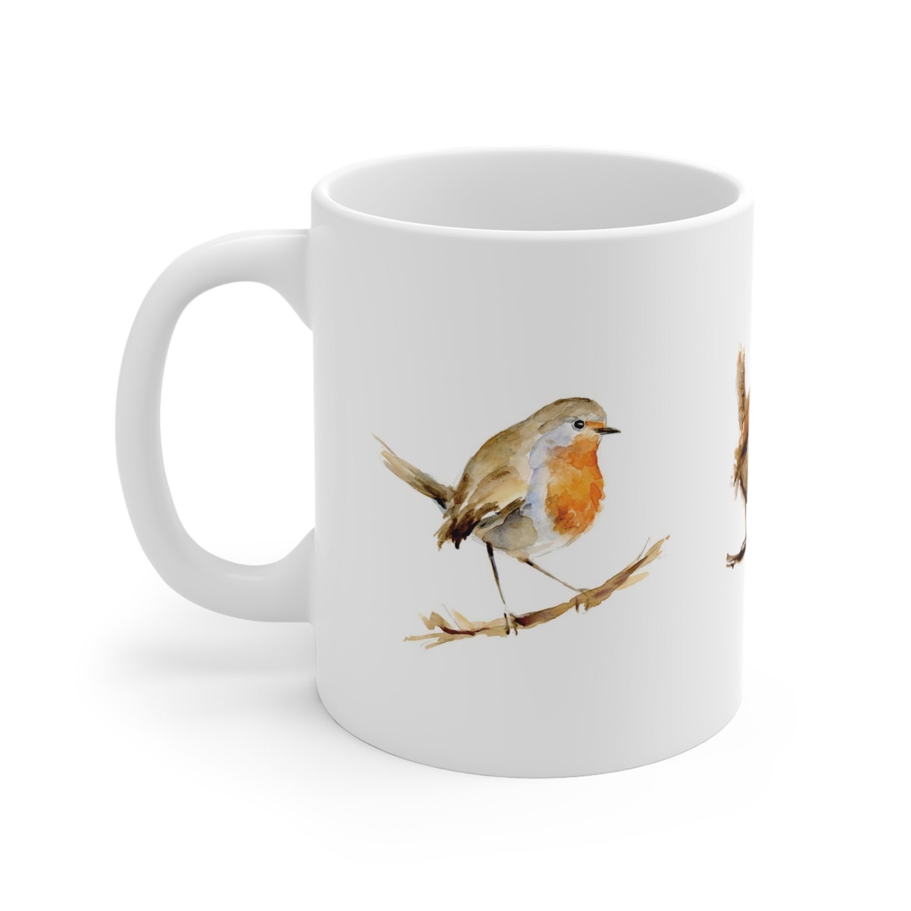 De mok is versierd met drie kleine vogeltjes — een roodborstje, blauwborstje en winterkoninkje — geschilderd in aquarel door Michelle Dujardin.